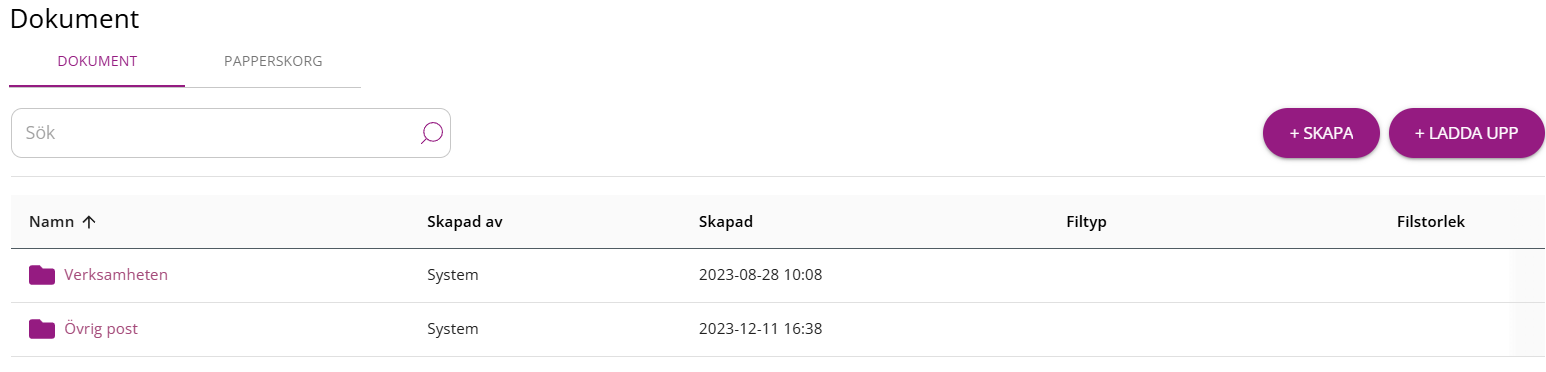 Vid start finns ett antal fördefinierade mappar – så kallade systemmappar. Dessa är markerade i blått och används av systemet för att koppla dokument till olika funktioner. Systemmappar kan inte raderas eller döpas om, men du kan skapa egna undermappar och ladda upp filer till dem.