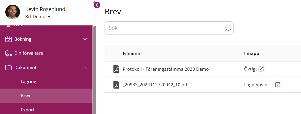 I funktionen "Brev" kan ni se de dokument som inkommit till er förvaltare eller skickats till er fakturamailadress. Härifrån kan ni eller er förvaltare placera dokumenten till korrekt mapp. Dokument som placerats i en mapp kan givetvis även hittas under dokumentlagringen.