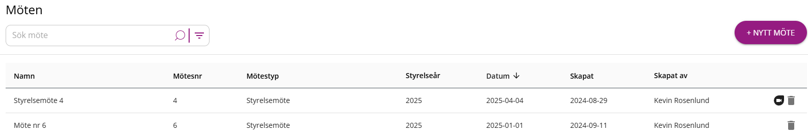 I listan över möten får du en överblick över alla möten ni har lagt upp i portalen.