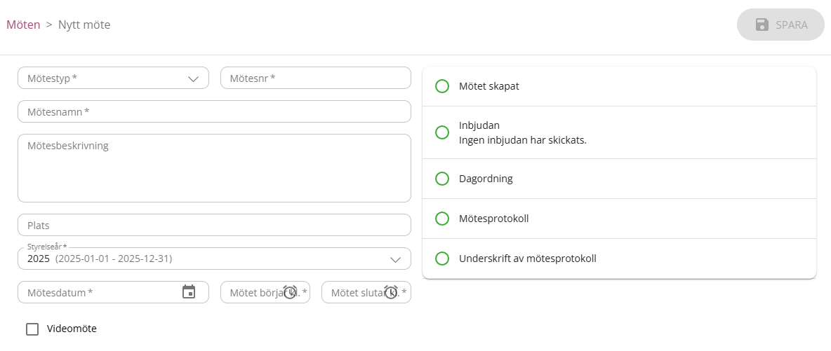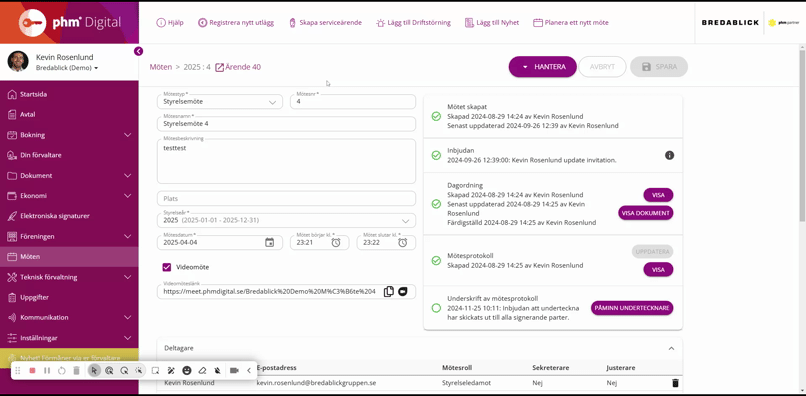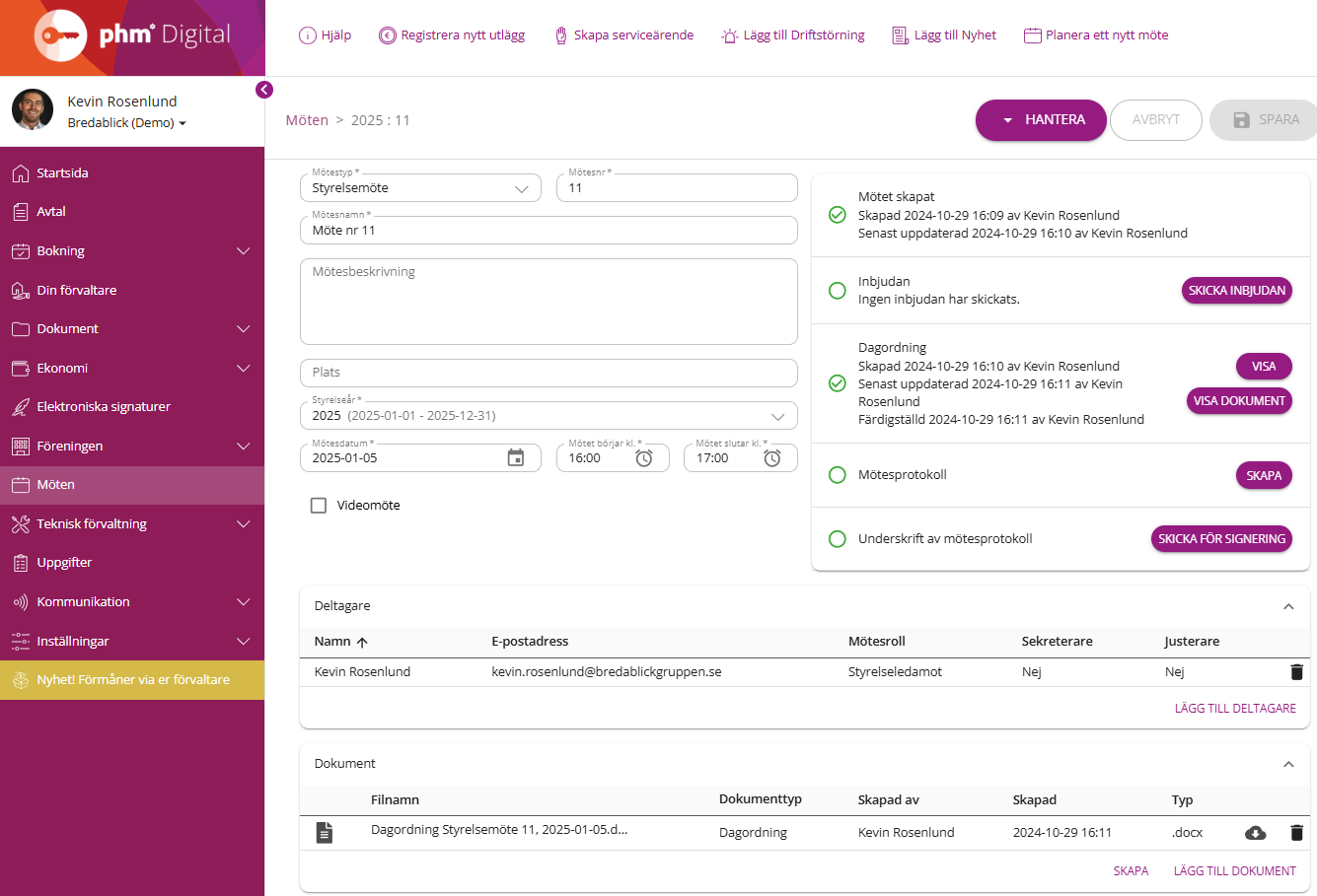 På högersidan visas en överblick av olika steg kring administrationen av mötet. Här kan man även utföra flera åtgärder, till exempel Skicka inbjudan till deltagare, skapa Dagordning, mötesprotokoll, och skicka protokoll för signering.