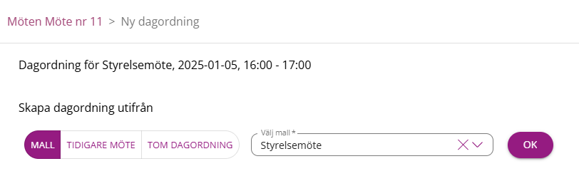 Ett steg i förberedelserna inför mötet är att skapa en Dagordning. Man kan välja att utgå från en helt tom dagordning för att skapa sin egen, men man kan också utgå från en mall med förslag på punkter, som man sedan kan anpassa till sitt eget möte. När man väl skapat en dagordning för ett möte kan man utgå från denna nästa gång man förbereder ett möte av samma slag.