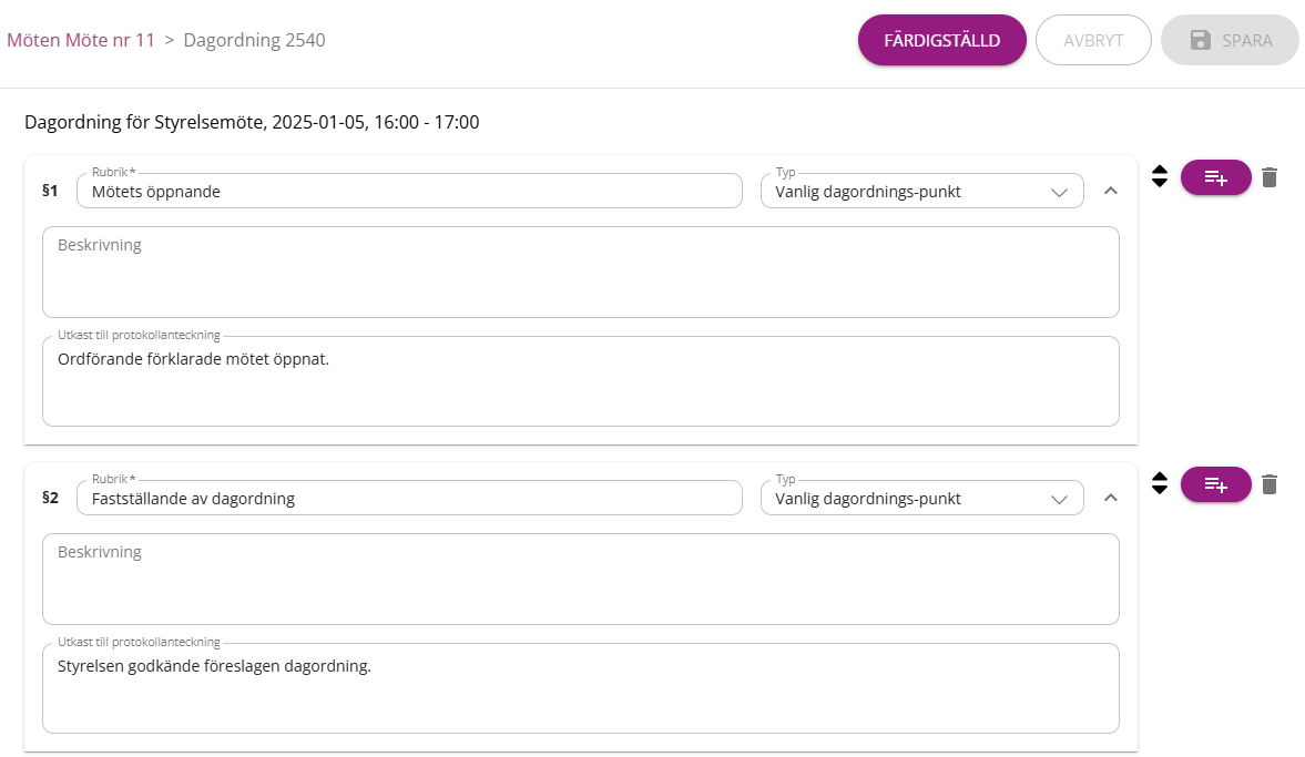Nästa steg är att göra klart dagordningen. Om du utgått från en mall, eller en gammal dagordning, korrigerar du enkelt denna genom att ta bort, lägga till, eller ändra ordning på punkterna på dagordningen. För varje punkt på dagordningen finns ett antal fält man kan fylla i: