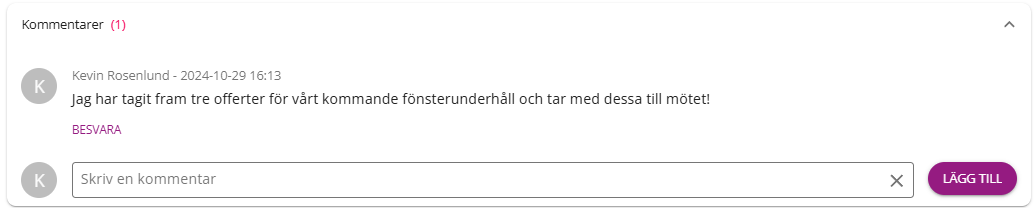 I kommentarsfältet kan du och alla andra användare i din förening skriva noteringar och händelser kring mötet som ni vill dela med varandra. Kommentarsfältet kan alltså användas som en dialog mellan styrelseledamöter, en händelselogg eller som ett anteckningsfält.
