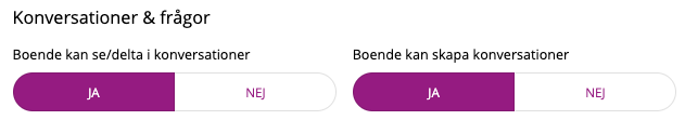 I den översta delen av inställningar för Konversationer & Frågor kan styrelsen avgöra i vilken utsträckning Boende ska ha tillgång till funktionen Konversationer.
