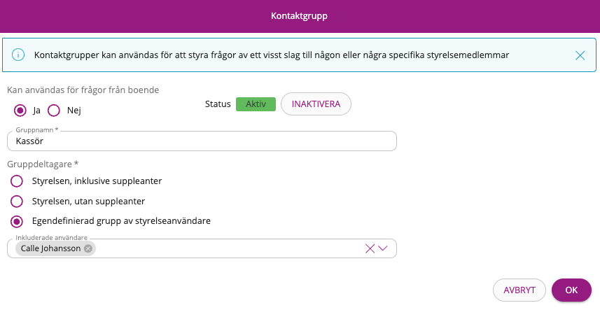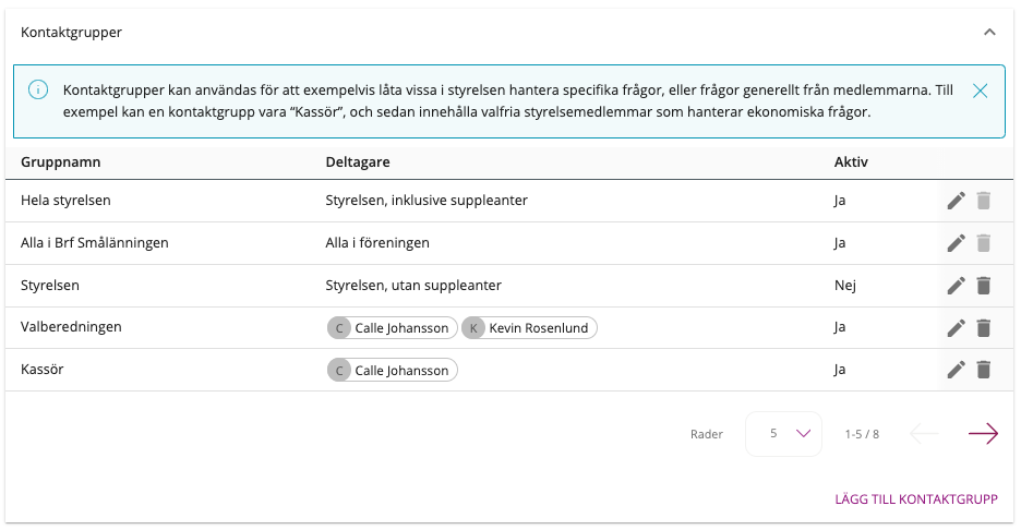 Kontaktgrupper används främst för att styra möjligheten att ställa frågor till styrelsen, och vem/vilka som ska besvara. Det finns även en kontaktgrupp för "Alla i föreningen" som kan användas för exempelvis ge alla tillgång till att delta i en Konversation.