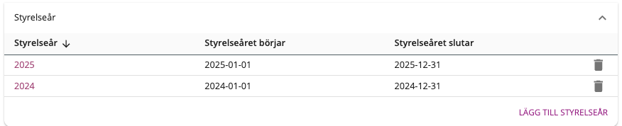 Här lägger man in föreningens styrelseår. Dessa används för att kategorisera Möten som skapas via PHM digital, så att rätt mötesdokumentation sparas på rätt år och därmed är lättillgängligt för revisor eller annan person som behöver tillgång till detta.