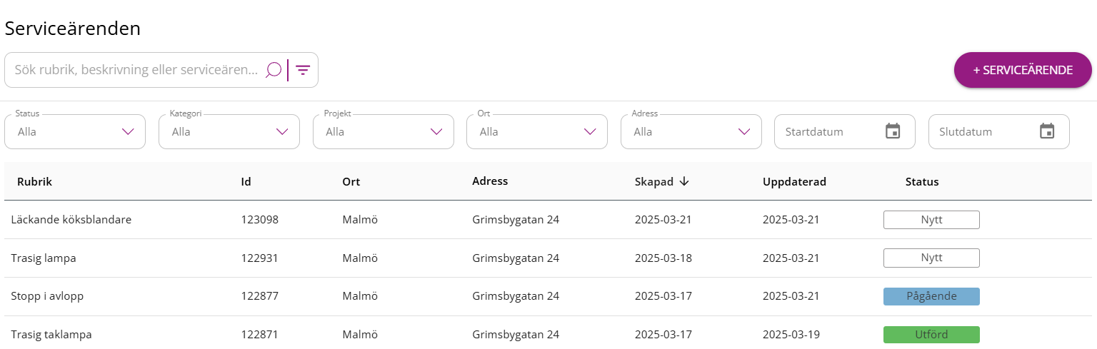 Under "Teknisk Förvaltning -> Serviceärenden" kan du se en lista över de serviceärende/felanmälningar som kommit in till din förening. Listan är sorterad efter datum där det senaste serviceärendet ligger överst.