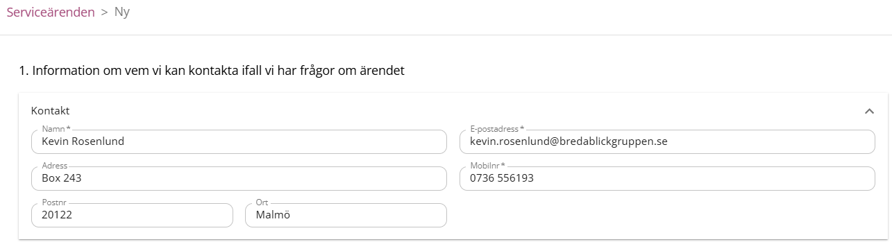 Del 1: Information om du som felanmäler ärendet hämtas automatiskt från din användare, ifall någon annan än du ska kontaktas i ärendet kan ni ändra kontaktuppgifterna under denna del.