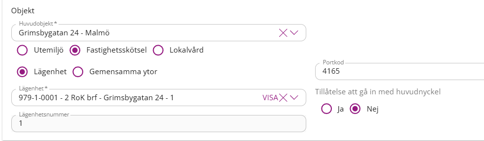Lägenhet/Gemensamma ytor - Välj om ärendet avser en lägenhet eller gemensamma ytor (såsom trapphus, miljörum, hiss eller grönytor). Väljer du lägenhet så kommer fält relaterade till detta upp, bland annat att välja lägenhet, att fylla i portkod och att ge tillåtelse att gå in med huvudnyckel. Väljer du gemensamma ytor så dyker det upp en ruta för att beskriva vilken gemensam yta ärendet avser.