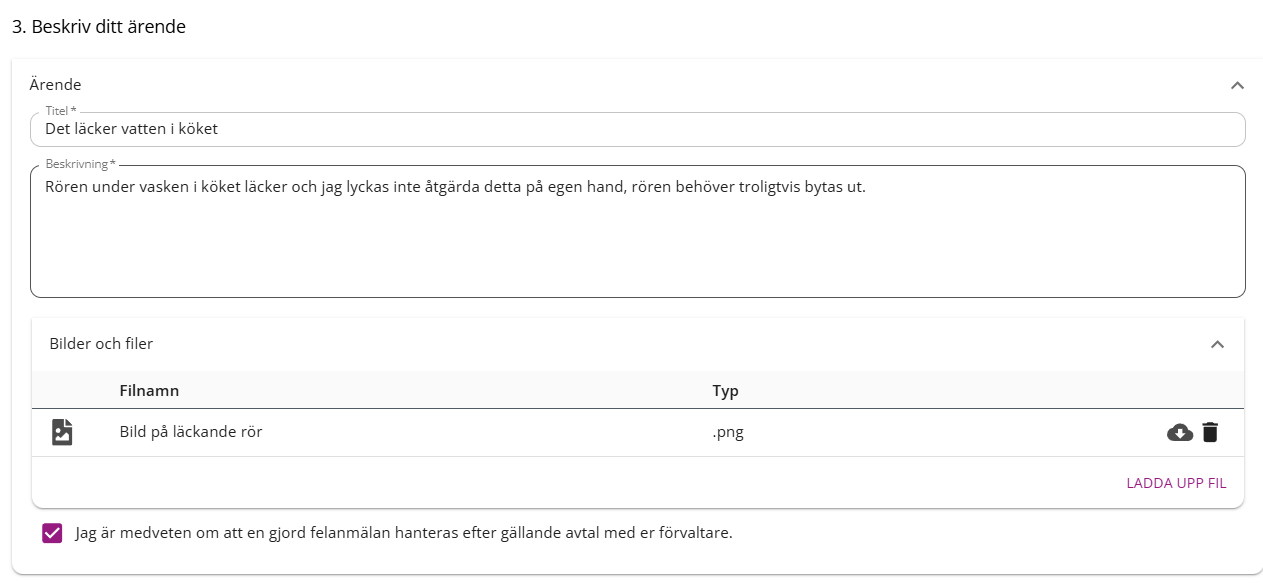 Bilder och filer - Här kan ni bifoga filer, dokument och bilder till felanmälan som kan vara av värde för förvaltaren som ska behandla ärendet.