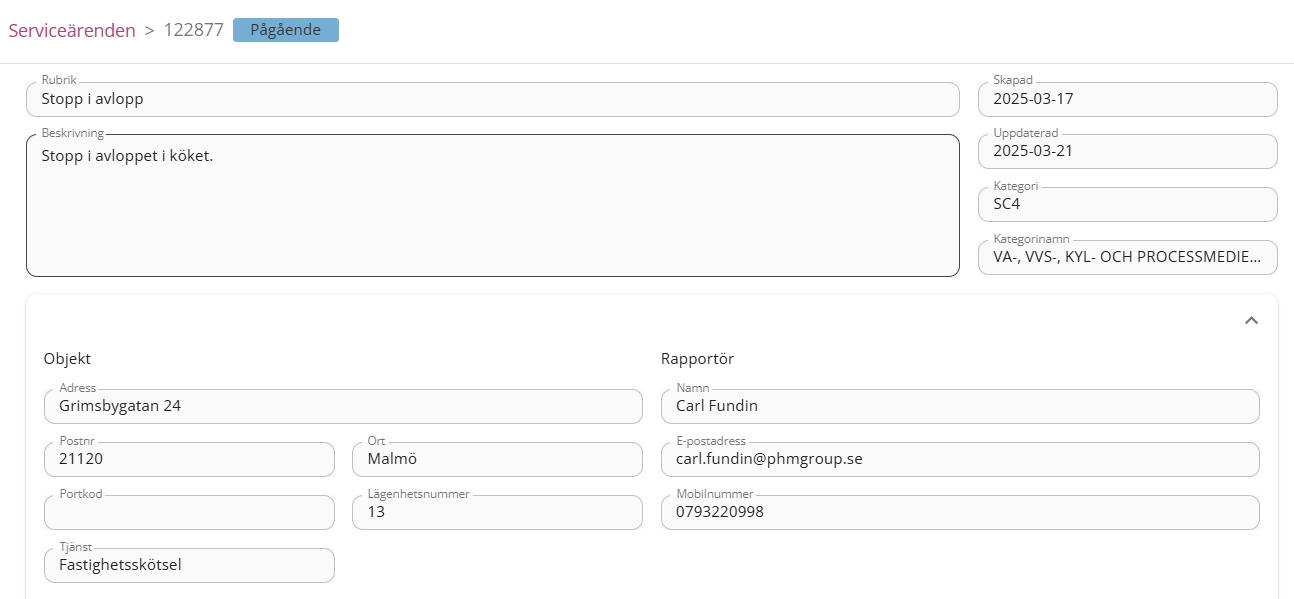 När du klickar på ett serviceärende i listan så öppnas en detaljerad vy upp där du kan se alla detaljer om det aktuella serviceärendet.