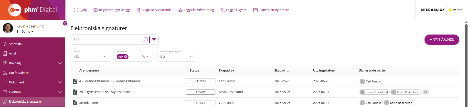 I listan får du en tydlig översikt över de signeringsärenden som är skapade för din förening. Du ser namnet på ärendet, vilken status ärendet har, vem som har skapat det, när det går ut och vilka som är signerande parter.