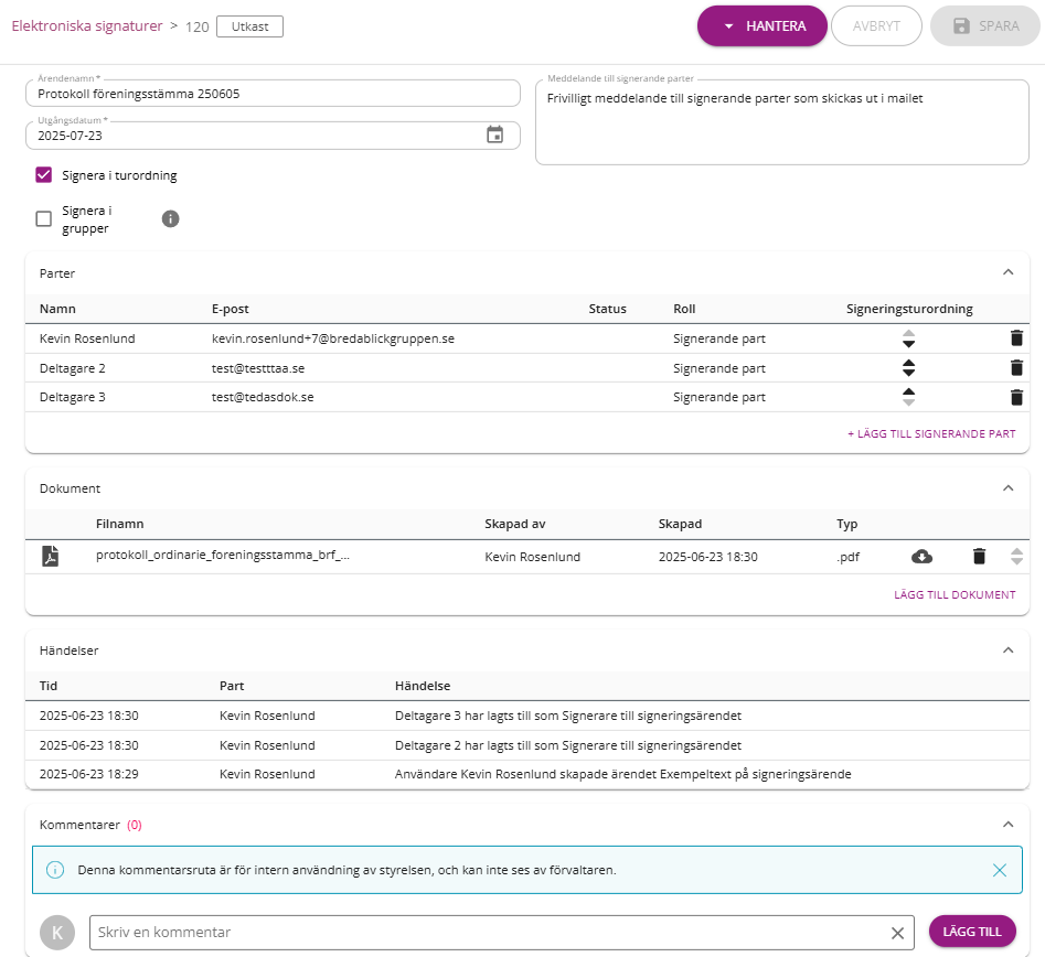 Här kan du och dina kollegor i styrelsen skriva kommentarer, noteringar och kommunicera kring signeringsärendet.