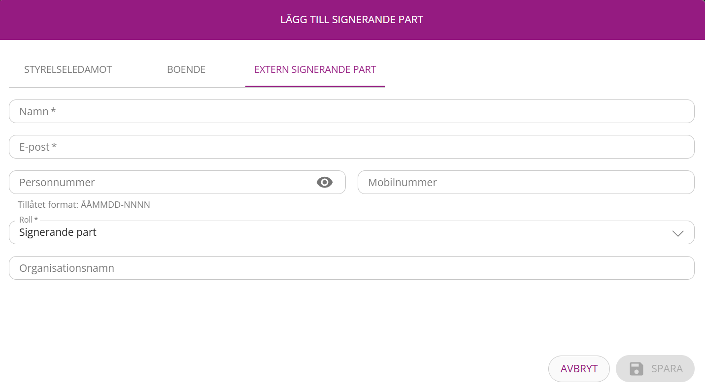 Det går även att lägga till externa signerande parter i den tredje fliken. Fyll då i Namn och E-post. Om personen ska signera med Bank Id så rekommenderas att fylla i Personnummer. Då sker en kontroll att rätt person signerar med sitt Bank Id. Om personen saknar Bank Id så kan denne signera via SMS-kod. Fyll då i personens mobiltelefonnummer.
