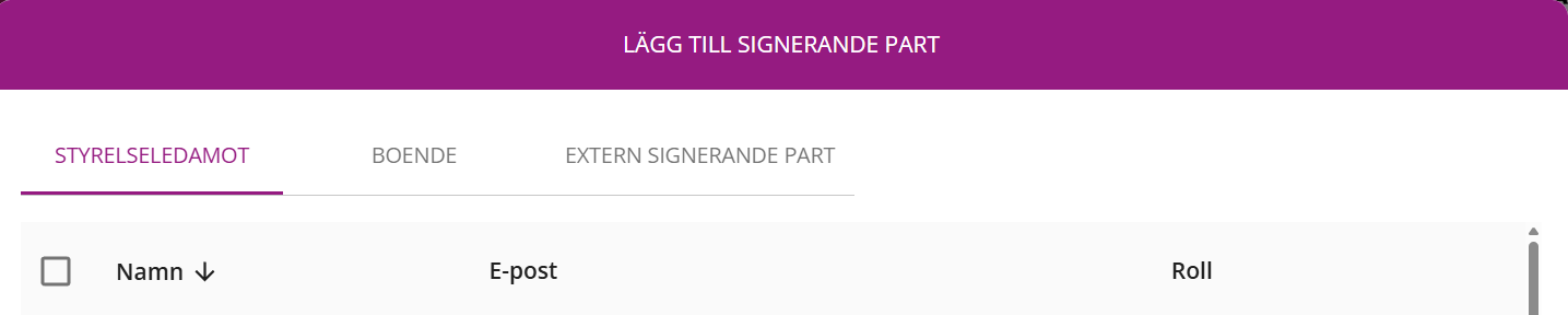 Klicka på länken "Lägg till signerande part" under listan över parter. Här kan ni välja bland de styrelsemedlemmar och boende som skapat en användare i PHM Digital och uppgifter från deras användare hämtas då och läggs in som signerande part.