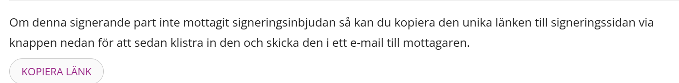 Efter att ett signeringsärende har skickats och fått status Skickat så går det ut mail till dessa. Vill ni vara säkra att personerna får signeringslänken så finns även möjlighet att kopiera den specifika länken för respektive signerande part. För att kopiera den unika länken så klickar ni på en signerande part i listan. I formuläret som öppnas hittar ni knappen Kopiera länk.Ett klick på den knappen kopierar länken till urklippsminnet och kan därefter till exempel klistras in i ett mail.