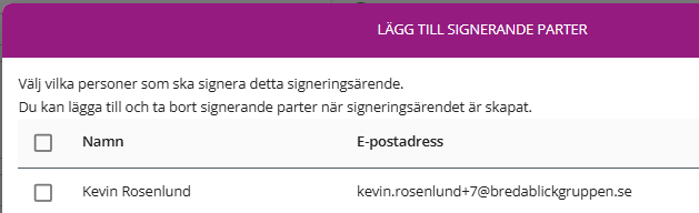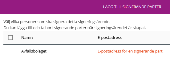 Parter - Här listas de som ska signera ärendet eller få information när ärendet är signerat. Användaren som skapar signeringsärendet läggs automatiskt upp som en signerande part.