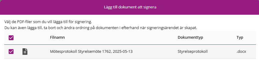 Du kan ladda upp ett eller flera dokument till signeringsärendet. Dokumenten kommer automatiskt att slås ihop till ett dokument när det skickas ut för signering. Dokumentet måste vara av filtypen PDF.