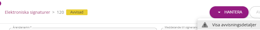 Avvisat - En av de signerande parterna har avvisat att signera ärendet. Den som avvisar måste skriva en kommentar om varför parten valt att avvisa ärendet. Kommentaren kan du läsa via Hantera-menyn eller genom att klicka på raden Om någon har hunnit att signerat ärendet så kommer de signaturerna att bli ogiltiga. Från status Avvisat kan man ändra status till Utkast via Hantera-menyn. I status Utkast kan du redigera ärendet och skicka ut det på nytt.
