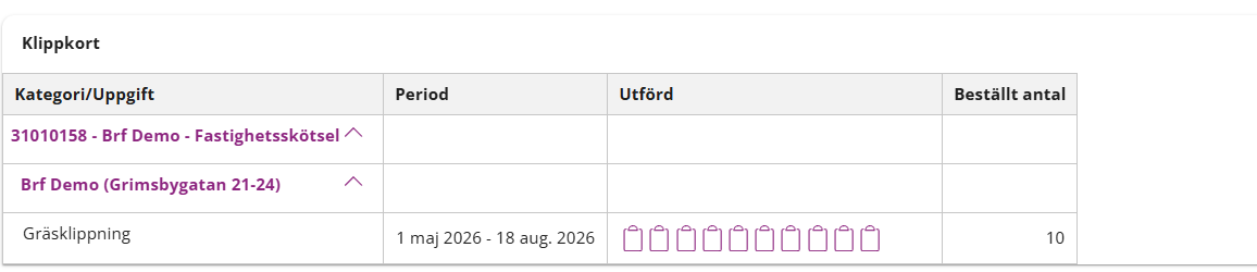 I systemet kan ni även se era klippkort hos förvaltaren, exempelvis för gräsklippning 🌿