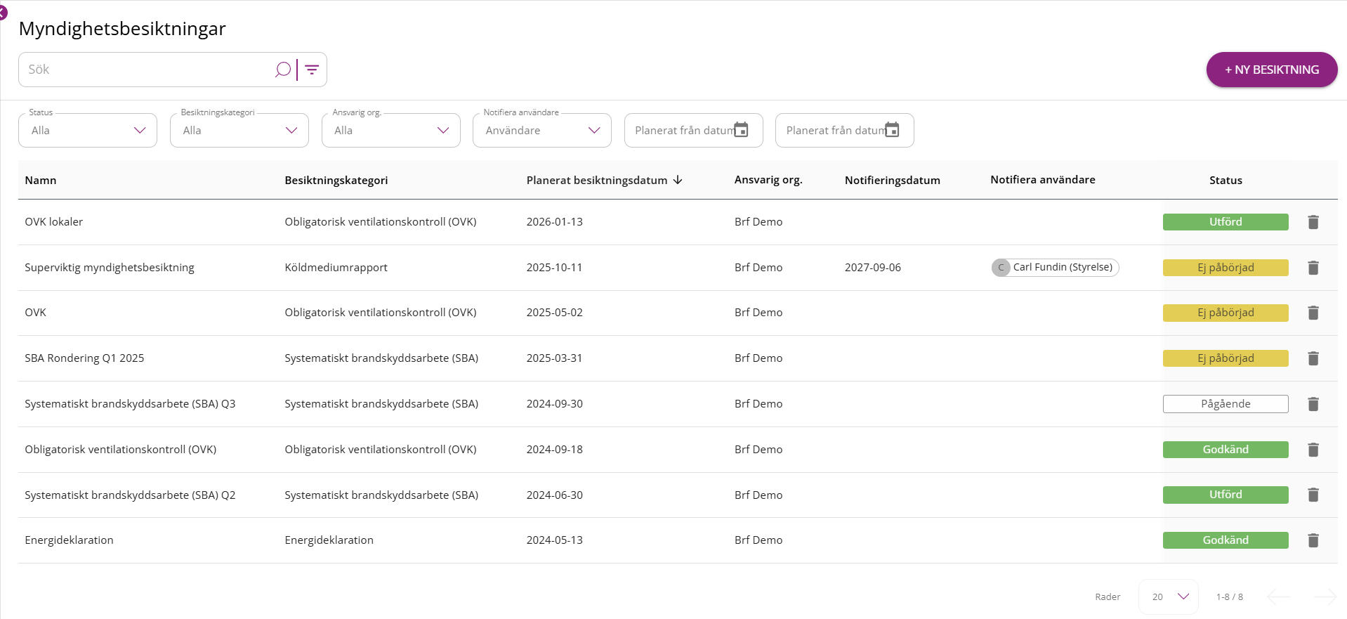 I översikten visas alla skapade myndighetsbesiktningar samlade i en lista, vilket ger en tydlig överblick över föreningens registrerade besiktningar.