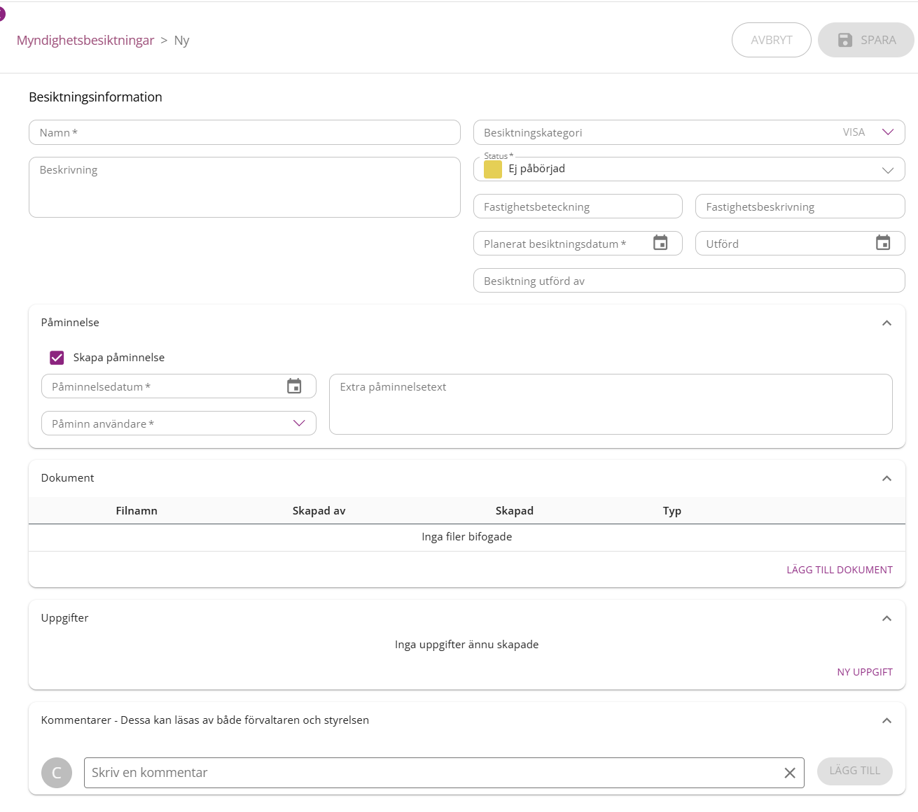 När ni skapar en ny myndighetsbesiktning kan följande information anges: