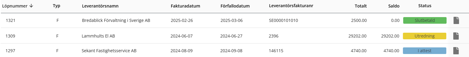 Listan innehåller alla leverantörsfakturor som finns upplagda för er förening i PHM Digital eller i vissa fall, även från förvaltarens tidigare system. Informationen kontrolleras löpande med er förvaltares ekonomisystem så att ni kan känna er trygga med att ni ser allt som er förvaltare ser kring dessa fakturor. I listan får du en snabb överblick över föreningens fakturor. I kolumnen Status ser du om fakturan har slutbetalats eller inte samt ifall någon faktura väntar på att attesteras eller ligger för utredning.