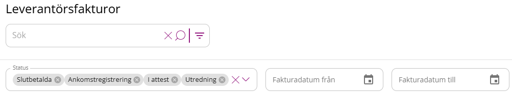 Under Ekonomi -> Leverantörsfakturor har du möjlighet att se er förenings samtliga leverantörsfakturor. Ni kan antingen bläddra i listan eller söka efter fakturor, samtliga fält i listan är sökbara. Trycker ni på filter-knappen kan ni filtrera fakturor utifrån en viss status eller en viss period.