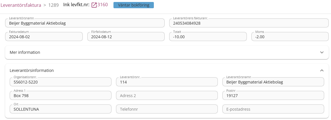 I den detaljerade vyn kan du se alla detaljer om en leverantörsfaktura, leverantören samt hur fakturan är bokförd.