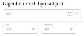 Du kan söka efter ett specifikt objekt i sökrutan. Trycker ni på filter-knappen så dyker det även upp möjlighet att filtrera på "Typ"(ex. 1 RoK, Garageplats, förråd) samt på "Objektstyp" (ex. Bostadsrätt, Hyresrätt, Parkering).