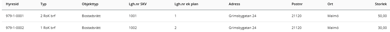 Under menyvalet "Föreningen -> Lägenheter och hyresobjekt" finns föreningens alla objekt samlade. Objektslistan hämtas från den ekonomiska förvaltarens fastighetssystem och innehåller samtliga objekt, både lägenheter samt eventuella lokaler, parkering, förvaring eller andra objektstyper.
