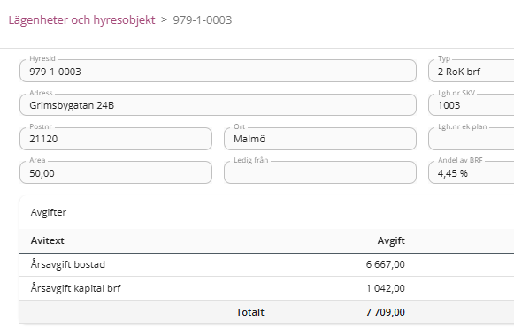 I den detaljerade vyn så kan du se detaljer om objektet; bland annat adress, lägenhetsnummer, andelstal och area. Undertill ser du även information om avgifter som är inlagda på objektet.