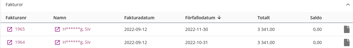 I listan över fakturor så kan du se de senaste fakturorna på objektet. Du får snabbt en överblick över belopp, fakturadatum och aktuellt saldo. Det går att förhandsgranska fakturan i Pdf-format genom att klicka på fil-ikonen längst ut till höger i listan.