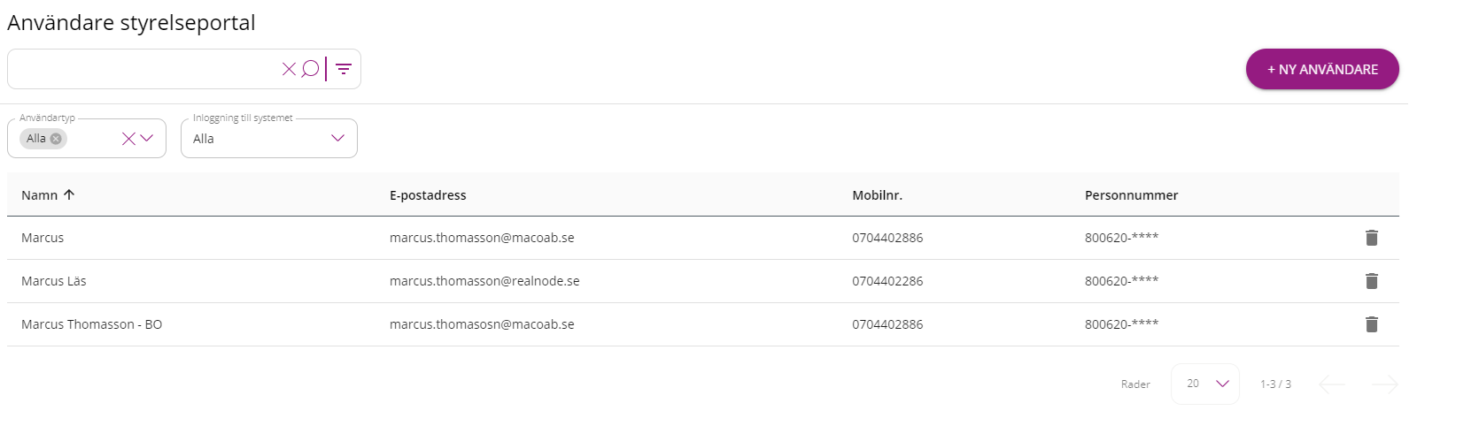 Du kan enkelt söker efter en specifik användare med hjälp av sökfältet. Du kan och så filtrera ut styrelseledamöter och de användare som ha möjlighet att logga in i systemet.