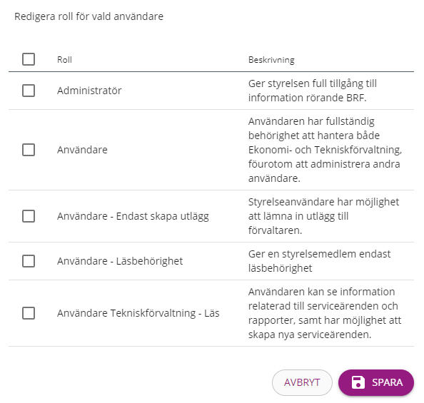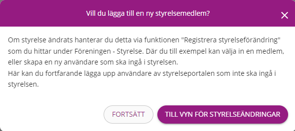 Om du tillhör en bostadsrättsförening och ska lägga till en styrelsemedlem, bör ni använda er av vår styrelseändringsfunktion. Läs mer här. Du får även en fråga om detta när du försöker lägga till en ny användare.