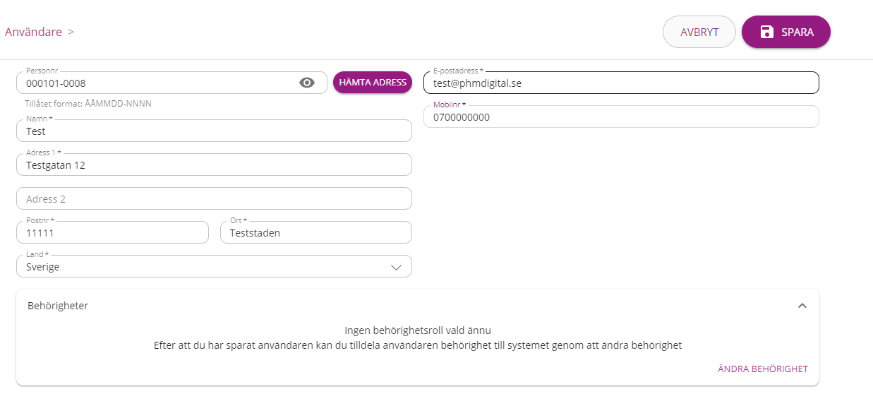 När du har fyllt i alla uppgifter om användaren, klickar du på Spara. Du kan därefter gå vidare och ge användaren behörighet till systemet.