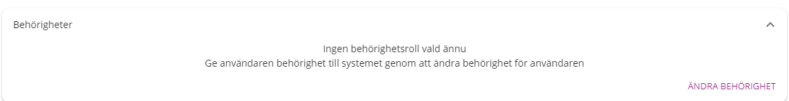 Du kan ge en användare behörighet till systemet genom att tilldela användaren en roll. Detta gör du genom att klicka på länken "Ändra behörighet". Där tilldelar du användaren en roll som lämpad för det arbete som användaren ska utföra i portalen.