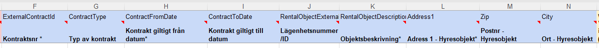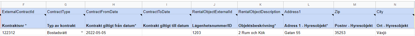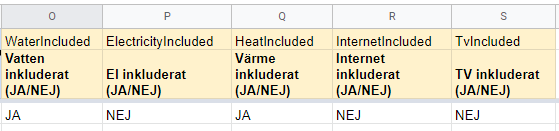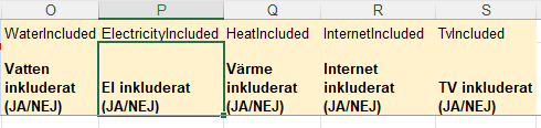 Kolumn O - S är frivillig information om ni vill läsa in information om vad som ingår i hyran för det aktuella objektet.