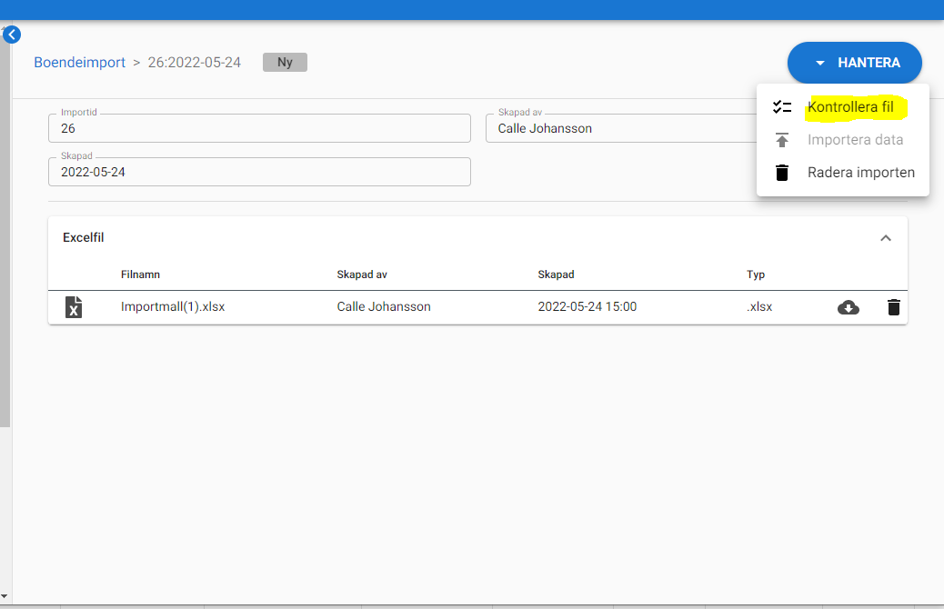 När du har laddat upp din Excelfil så klickar du på knappen Hantera och väljer Kontrollera fil