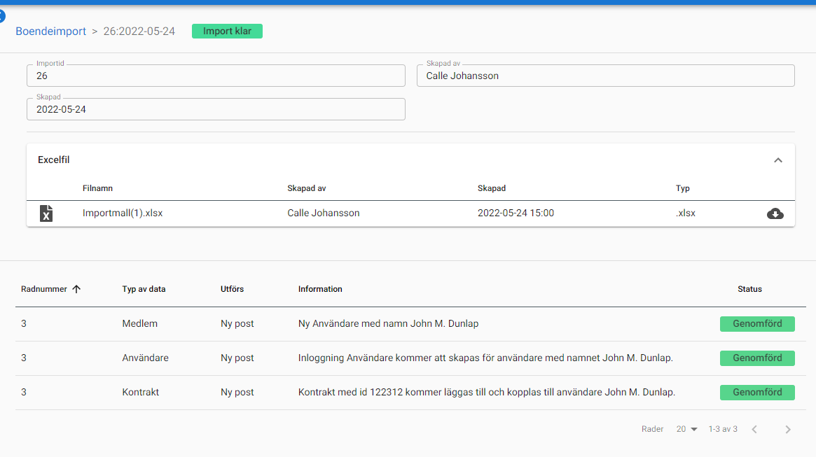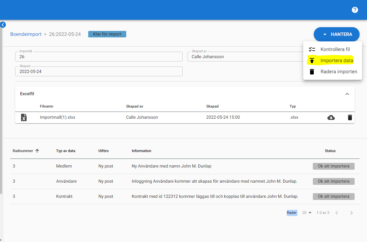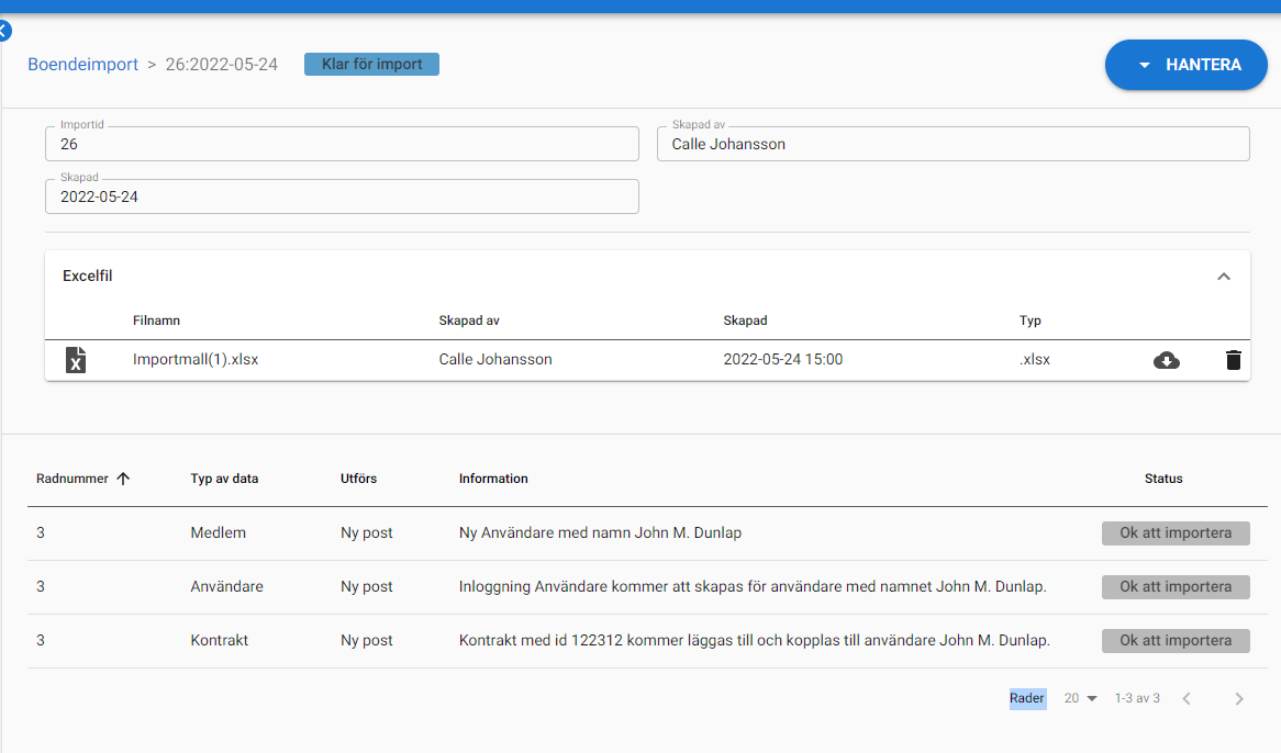 På raderna beskrivs vad som kommer ske med informationen på respektive rad i Excelfilen och om raden är ok eller om den innehåller fel.