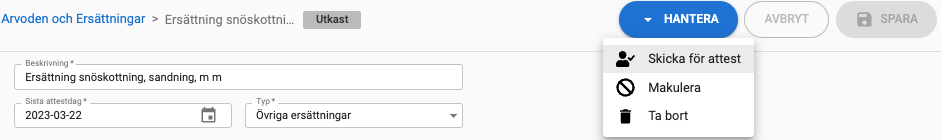 När registreringen är komplett kontrollerar du om någon attestmall är vald, om inte väljer du en sådan, Sparar, och väljer sedan Hantera - Skicka för attest.