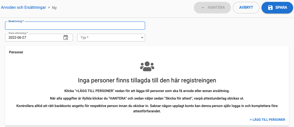Börja med att fylla i en beskrivning, exv Styrelsearvoden för 2022. Välj sedan Sista attestdag (denna styr när det blir påminnelser till attestanter), samt vilken Typ, t ex Arvode.