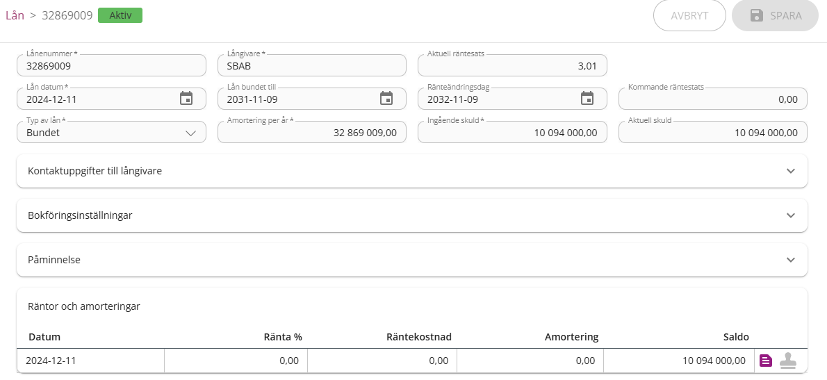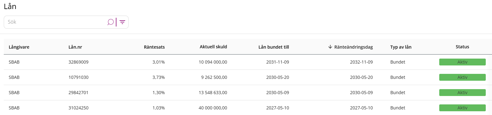 Syftet med denna funktion är att ge styrelsen en enkel och snabb överblick över föreningens lån, inklusive räntesatser och debiterade amorteringar. Styrelsen kan också få tillgång till villkoren som är kopplade till varje lån.