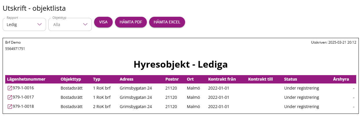 Med denna utskrift så kan ni ta fram en översikt över uthyrningsstatusen för de olika objekten i er förening.